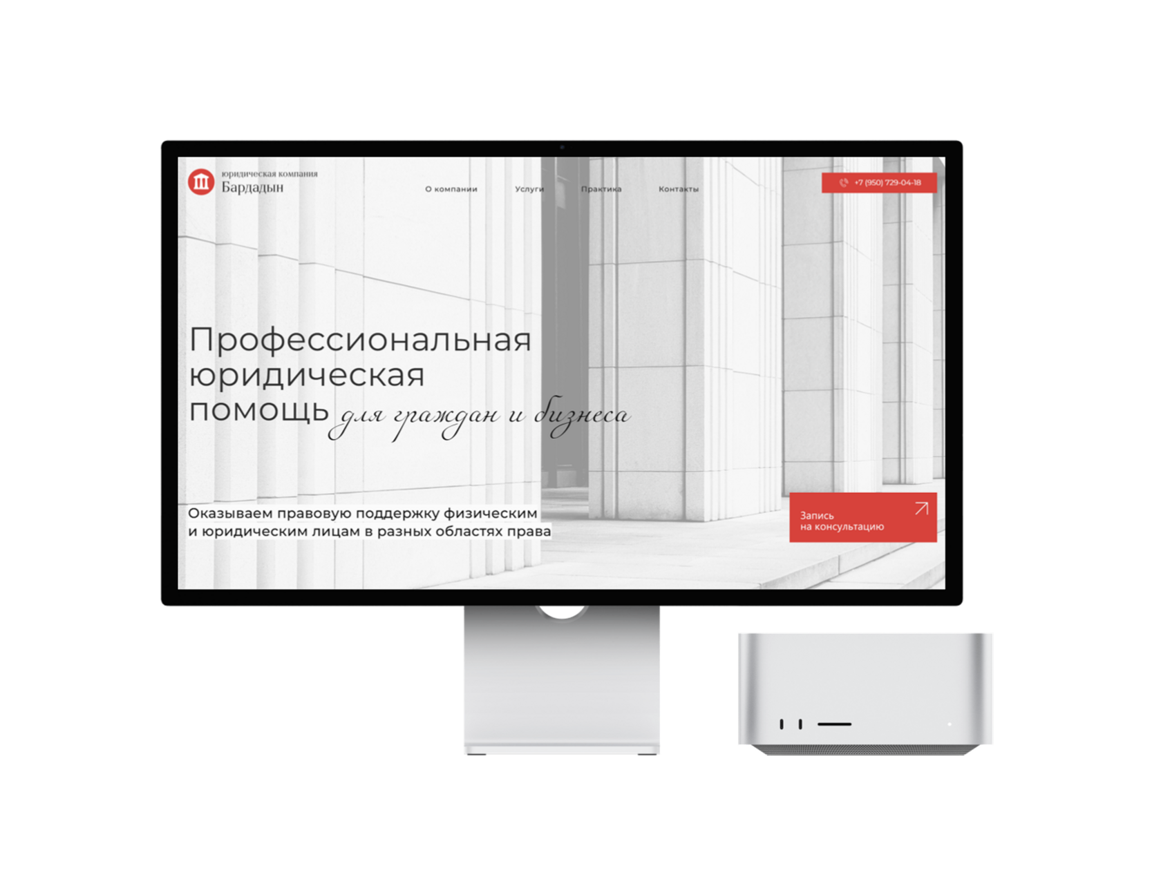 Нейтральные фоновые цвета и прямые углы в оформлении позволяют отразить строгость правовой сферы. Яркий красный цвет подобран исключительно для акцента на некоторых важных заголовках и кнопках с целевым действием. А минимализм в концепции позволяет отбросить всё лишнее в пользу лаконичности и простой функциональной композиции.